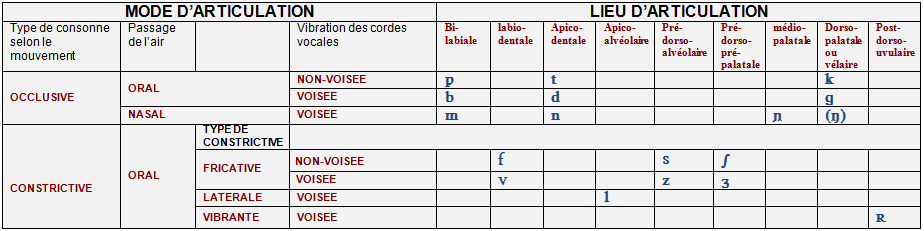 Les traits distinctifs du point de vue de l'articulation et pertinents du point de vue de l'opposition phonologique des phonèmes du français sont :