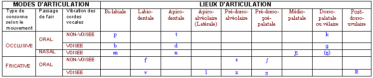 | Cordes vocales | - sonore (vibration des cordes vocales) - sourdes (pas de vibration des cordes vocales) |